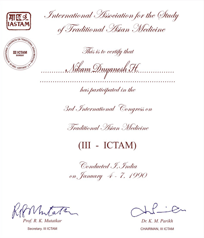 Paper Reading done before Research Society of Ayurveda in Japan at Okayama in 1987 on the Subject Ano Rectal Diseases and Ayurvedic treatment. Paper Reading done in All India Colo-Rectal Mid term Conference at Bombay Hospital in Sep 1991.