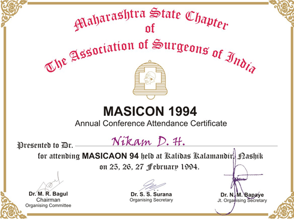 Done Paper Reading at ASIAN MEDICAL DOCTORS ASSOCIATION, Conference at K.M.C. Medical College. Manipal Karnatka University Feb 1992. Won prizes for Paper Reading on "Ayurvedic Treatment of Fistula in ano" in 9th Annual Surgeons Conference Maharashtra. Feb.91.